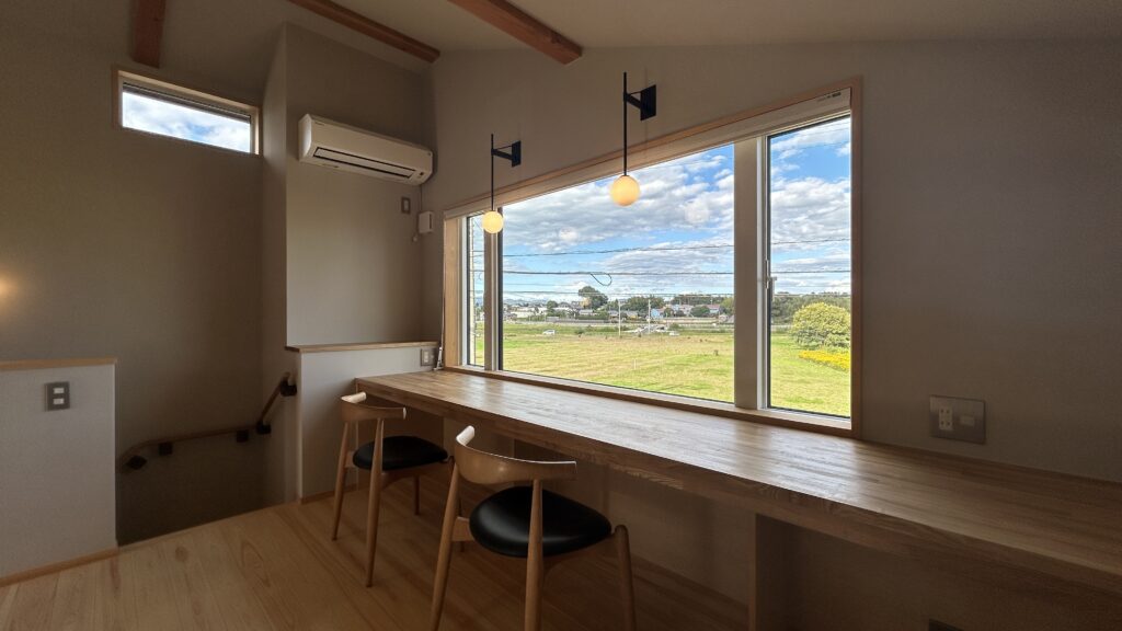 上の写真は、北側に広がる筑波山を望む壮大な借景です。大開口の窓から取り込んだ眺望は、日々の暮らしの背景として豊かさをもたらし、窓際のデスクでふと目を上げれば大きな風景が広がる、心ほどけるワークスペースを実現しています。