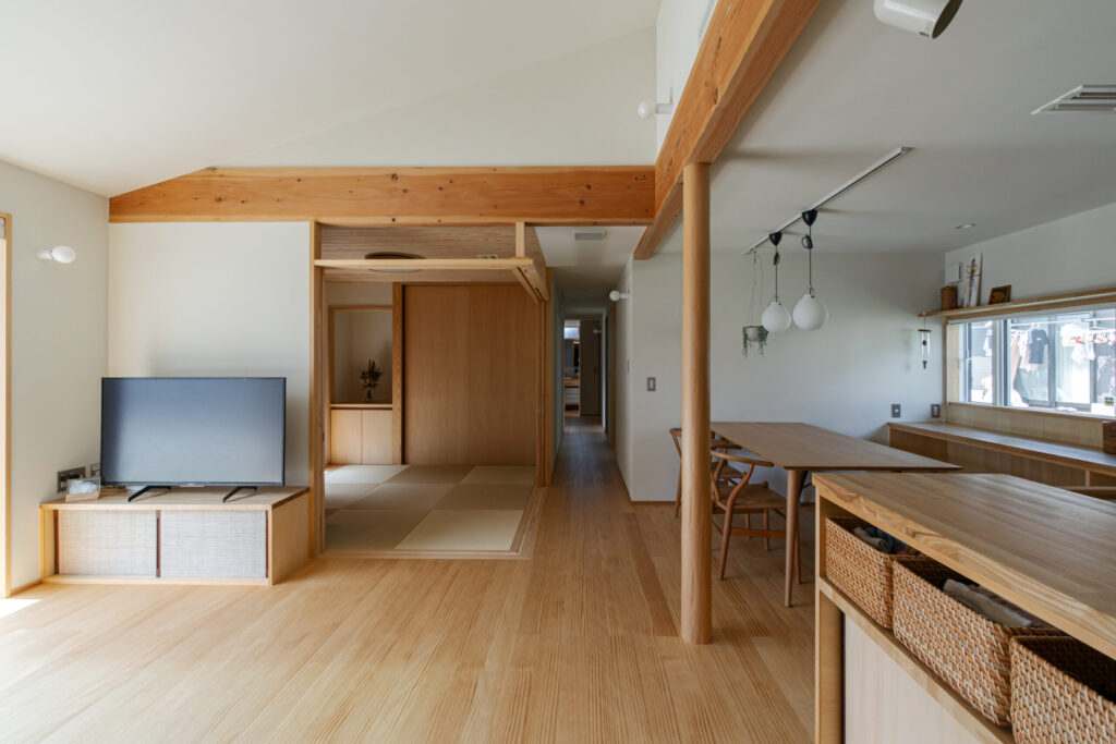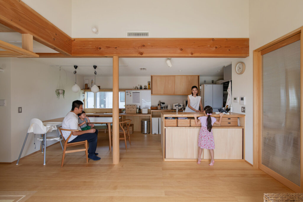 リビングの大きな窓には、木製の格子戸を設置。外からの視線をやわらかく遮りながら、窓を開ければ広々としたウッドデッキへとつながり、内と外が一体となる開放感を生み出します。四季折々の自然を感じながら、家族が自然と集う心豊かな空間となっています。