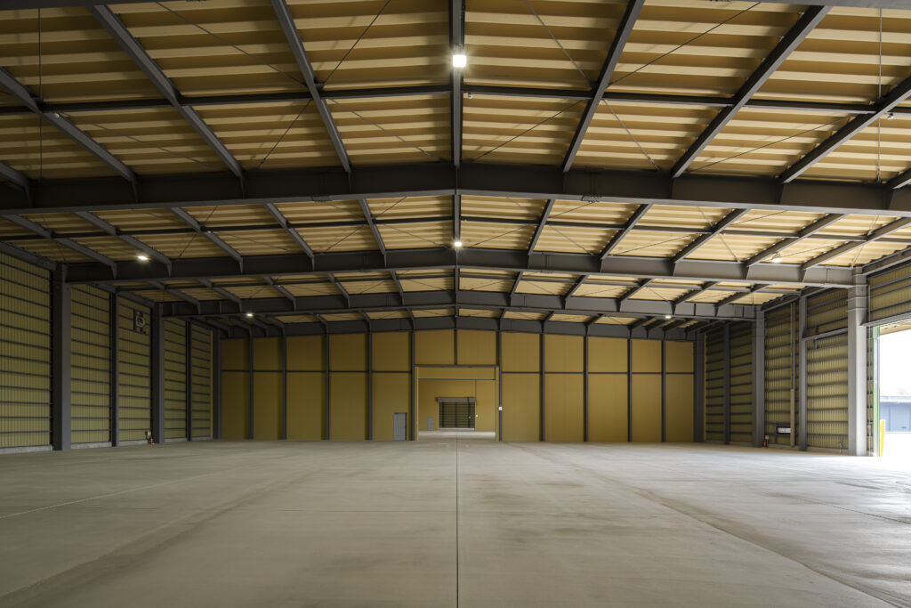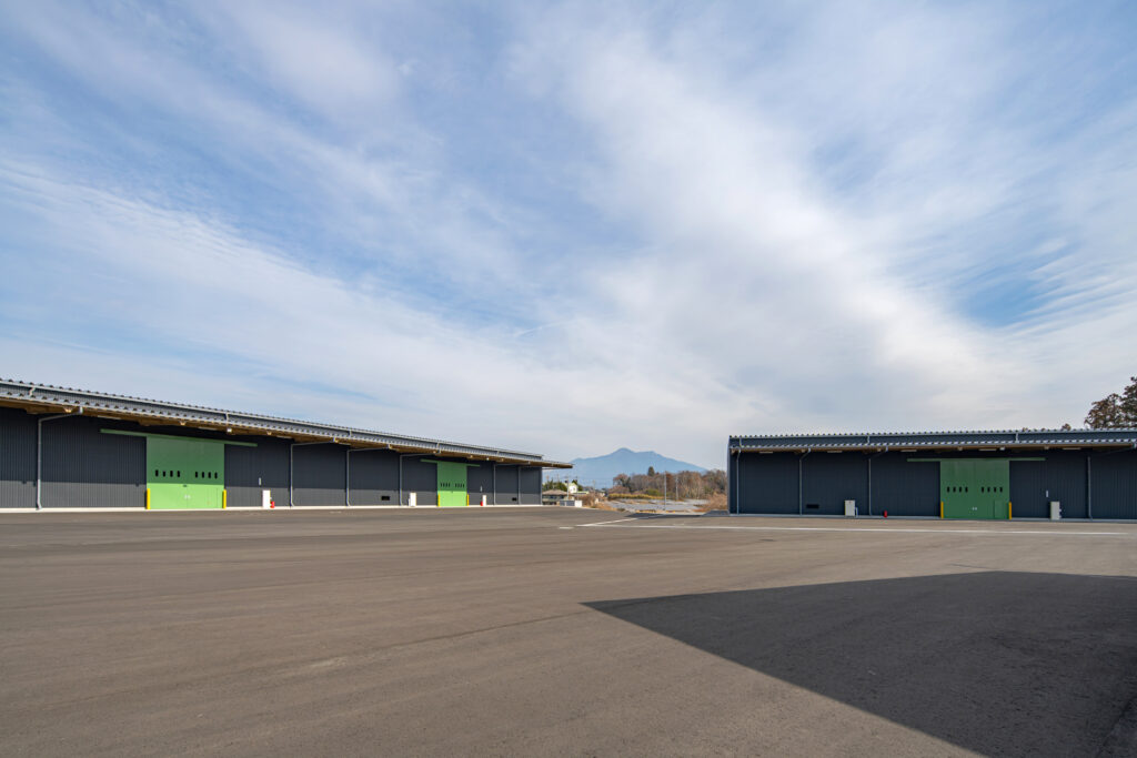 完成したのは、広い敷地に堂々と並び立つ、鉄骨造の大規模な倉庫2棟。