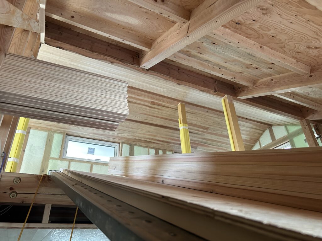 現在、内部では天井の無垢板張り工事の真っ最中。
