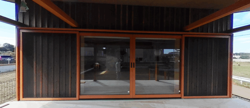 今回の現場では、木製大開口窓「アイランドプロファイル」の取り付け工事を行いました。採用したのは2本引き分けタイプで、高さ2m、総幅6.1m、開口寸法は3m弱に及ぶ迫力ある仕様です。