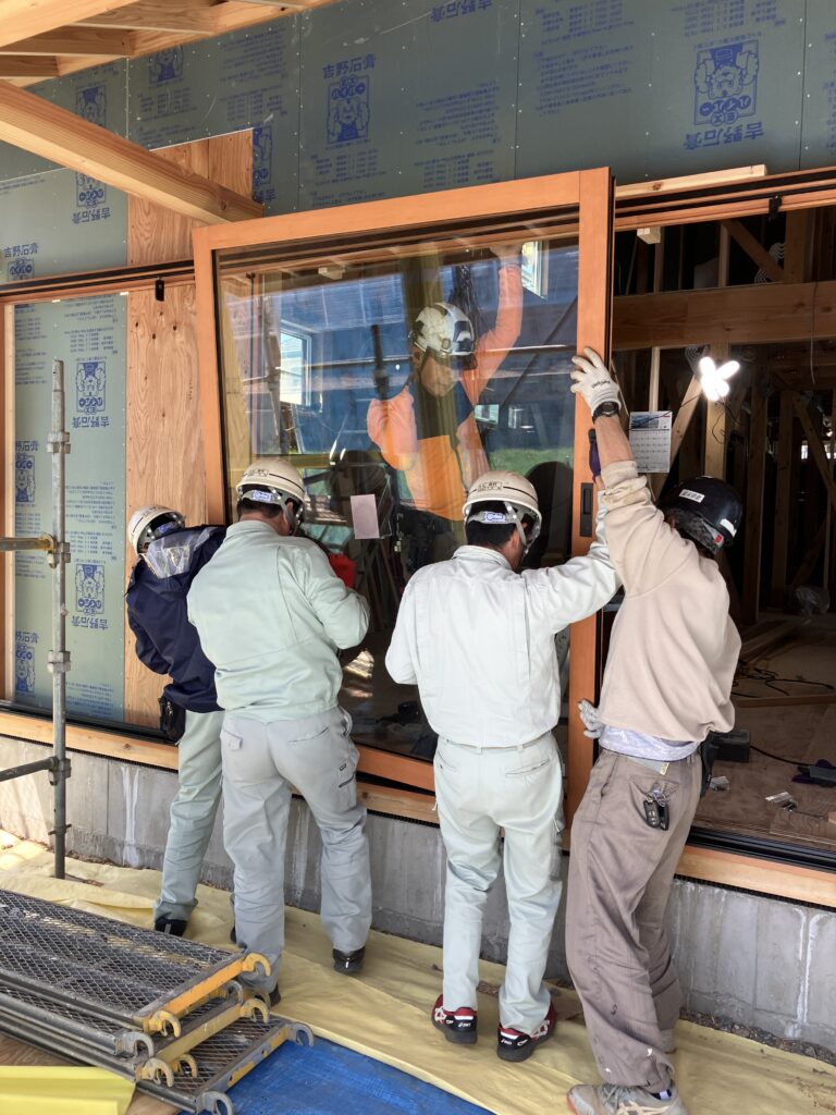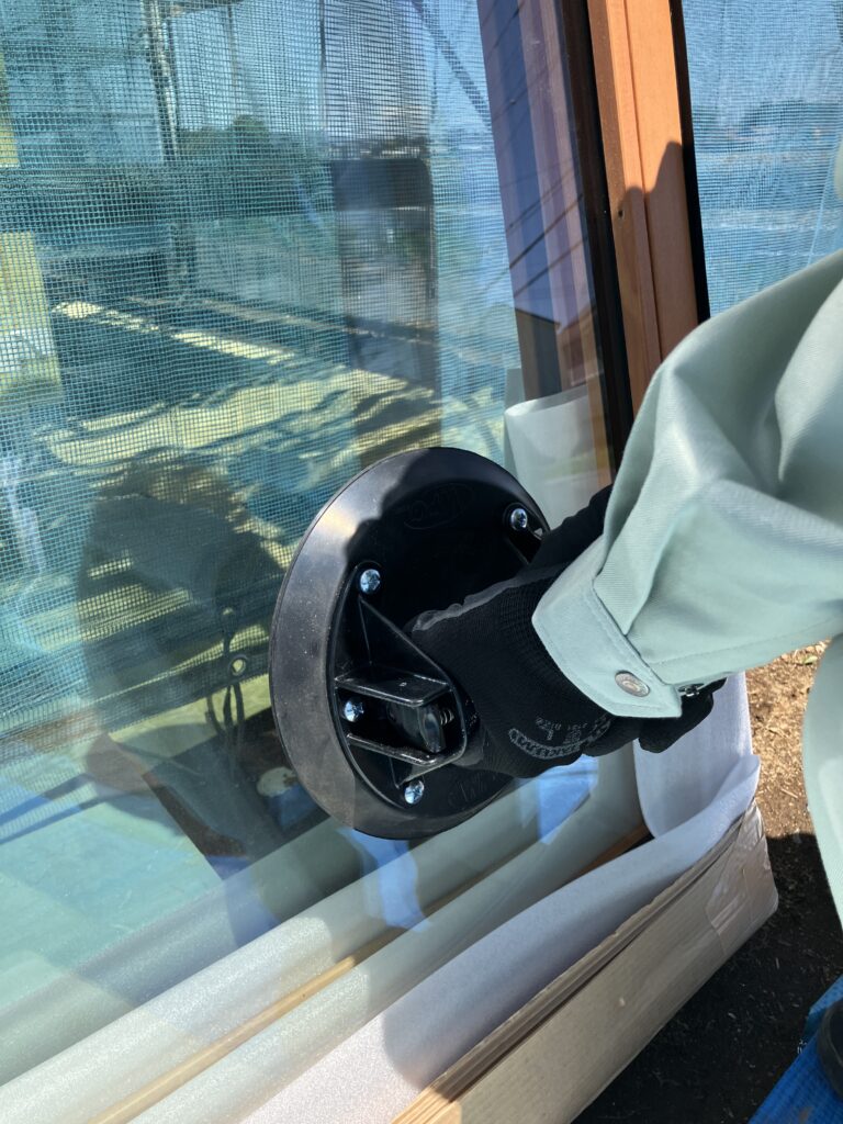設置するガラスは1枚で100kg以上、重いものでは200kgを超える重量級。そのため、吸盤を使って慎重に持ち運び、現場監督4名と大工1名の5名体制で安全に設置を行いました。