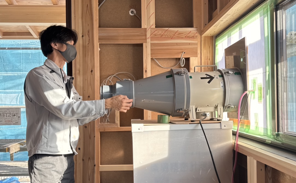 現在工事が進んでいる新しいモデルハウスにて、住まいの性能を左右する「気密測定」を行いました。