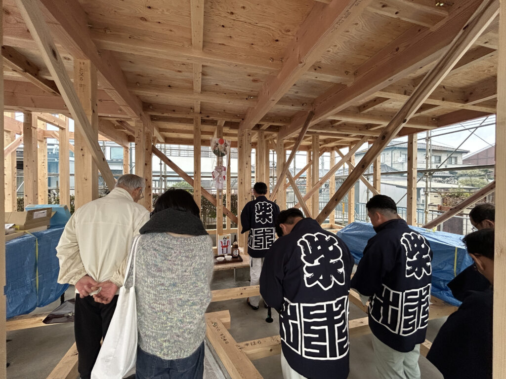 一気に柱が組み上がり、家の形が現れる様子はいつ見ても圧巻です。同日には、工事の無事と家内安全を祈願する「上棟祭」も執り行われ、スタッフ一同、身の引き締まる思いで参列いたしました。