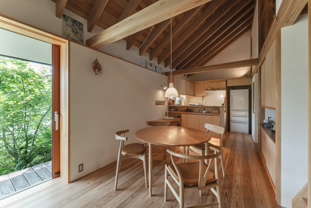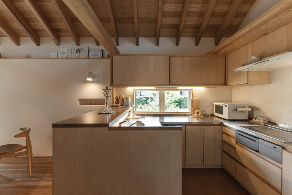 木の質感をそのまま活かした天井。見上げると、規則正しく並ぶ梁と美しい木目が重なり合い、空間全体にあたたかさと心地よいリズムが生まれます。素材のやさしさが、日々の暮らしに落ち着きと豊かさを添えてくれる住まいです。